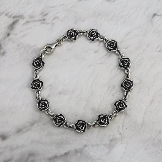 Sサイズ(2個)Mサイズ(4個)をサイドにセンターはLサイズのローズを連ならせた繊細さとインパクトを兼ね揃えたブレスレット。 ギフト&ペアにもオススメです。 サイズ:19センチ 材質:Sil…