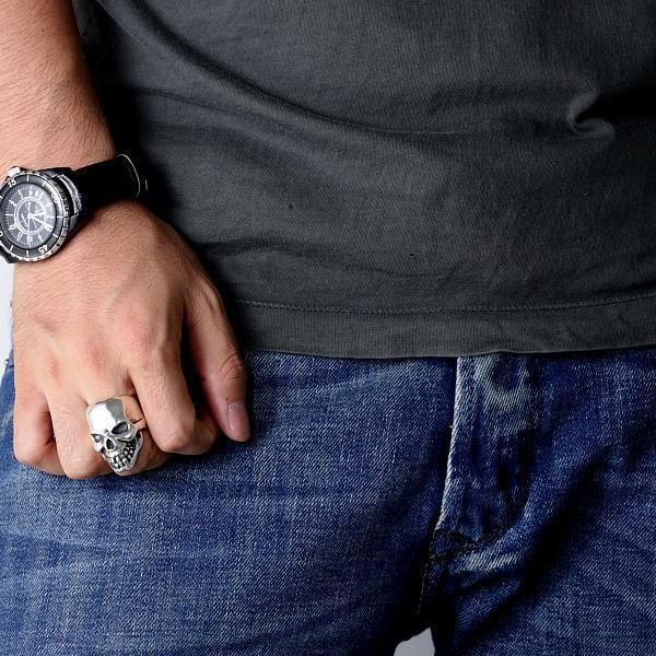重厚感のあるボリュームと洗練されたフォルムが、とてもスタイリッシュでクールなスカルリングです。