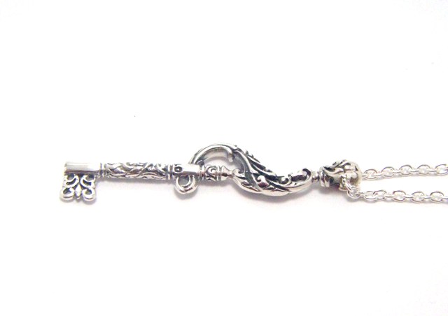 アイビー(蔦)とは「力強い生命力」の象徴としたうえで、それに「勢い」を加えるための炎の形状を加えたアイビー・オブ・フレームに『新しい未来を切り開く』『イヤな過去を閉じ込める』が意味合いの鍵(キー)をセットした素敵なペンダント。