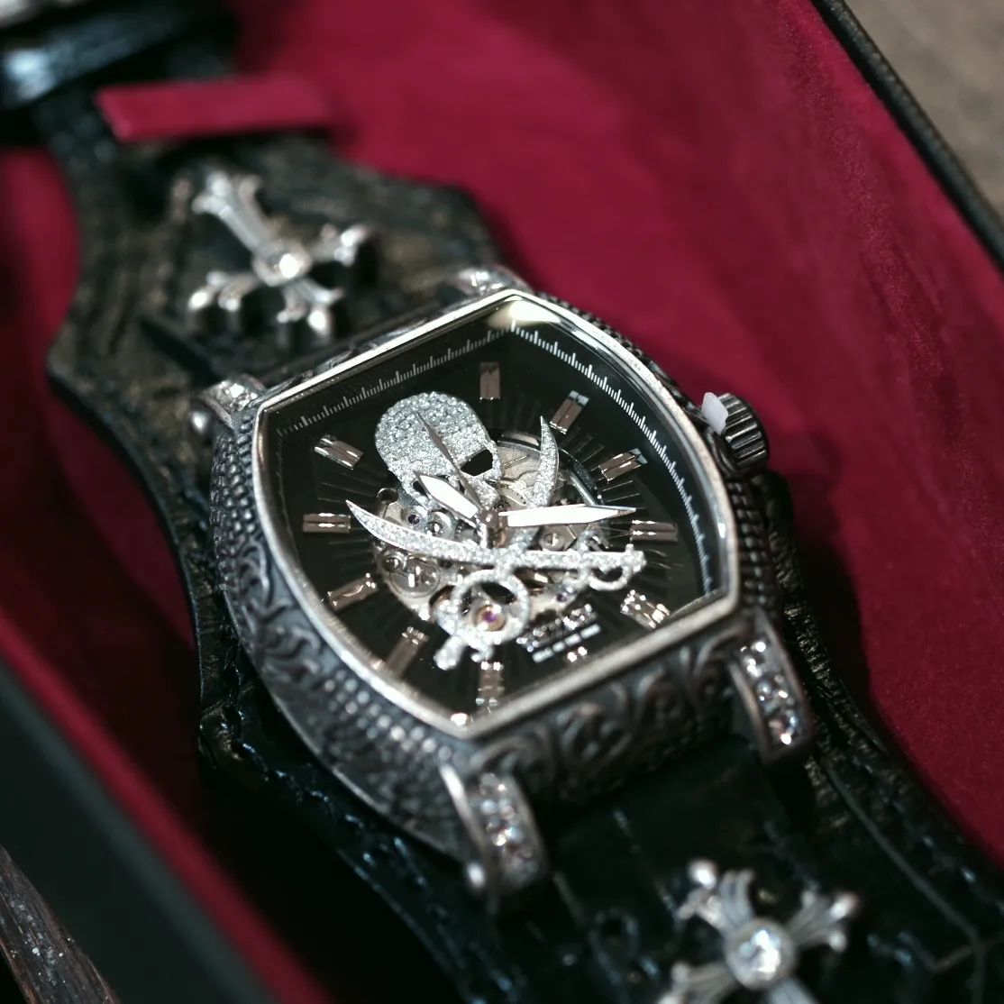 ブランド初の自動巻きモデル、スケルトンダイアルにはスカルソードが輝き、