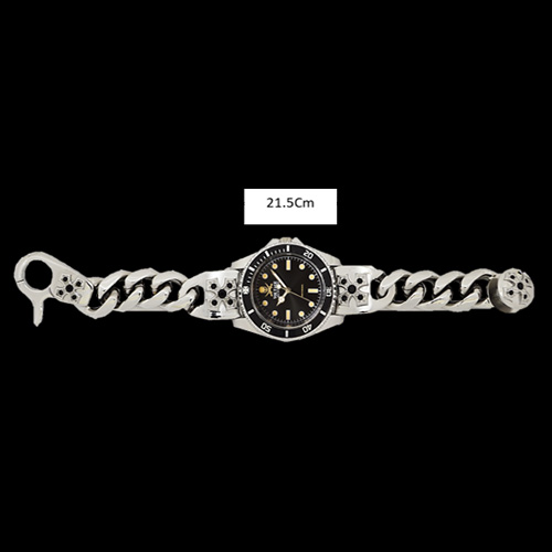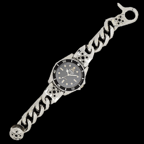 チェーンベルトを採用し、アクセサリー感覚で使いこなせるモデルです。文字盤にはスカル。ベルトにはクロスモチーフをあしらいました。