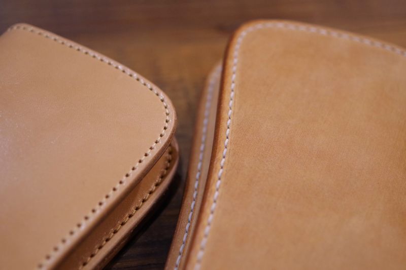 非常に手間がかかっているコバ仕上げ。左は数年使用した同カラーのテキサスのエイジング。